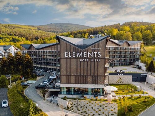 Ein Hotel mit ausgezeichneter Lage Bewundern Sie die einzigartige Lage in der Kurstadt Świeradów-Zdrój. Ein Kurhotel mit Außenpool, umgeben von der stimmungsvollen Kulisse des Isergebirges, mit einer ausgezeichneten Lage in der Nähe der Attraktionen in der Umgebung, finden Sie einen Ort, an dem Sie sich vollkommen entspannen können. Das Elements Hotel & Spa wurde mit viel Liebe zum Detail erbaut und besteht aus drei Flügeln, die in einem 120-Grad-Winkel zueinander stehen, so dass Sie von fast jedem Zimmer aus einen außergewöhnlichen Blick auf die Berge genießen können. Die Fassade nimmt Bezug auf die traditionellen architektonischen Elemente der Region, eine Kombination aus Holz, Stein, hellem Beton und Glas. Dadurch fügt sich das Gebäude vollständig in die einzigartige Landschaft des malerischen Dorfes im Riesengebirge ein.