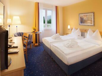 Die 153 Zimmer im H+ Hotel & SPA Friedrichroda unterteilen sich in Einzel- und Doppelzimmer sowie – auch für Familien geeignete – Suiten im Nebengebäude. Die Grundausstattung umfasst einen Schreibtisch, einen Safe und einen Fernseher mit gratis Sky-TV. WLAN nutzen Sie ohne Aufpreis. Zustellbetten sowie Babybetten sind in der Kategorie Doppelzimmer Komfort möglich.
