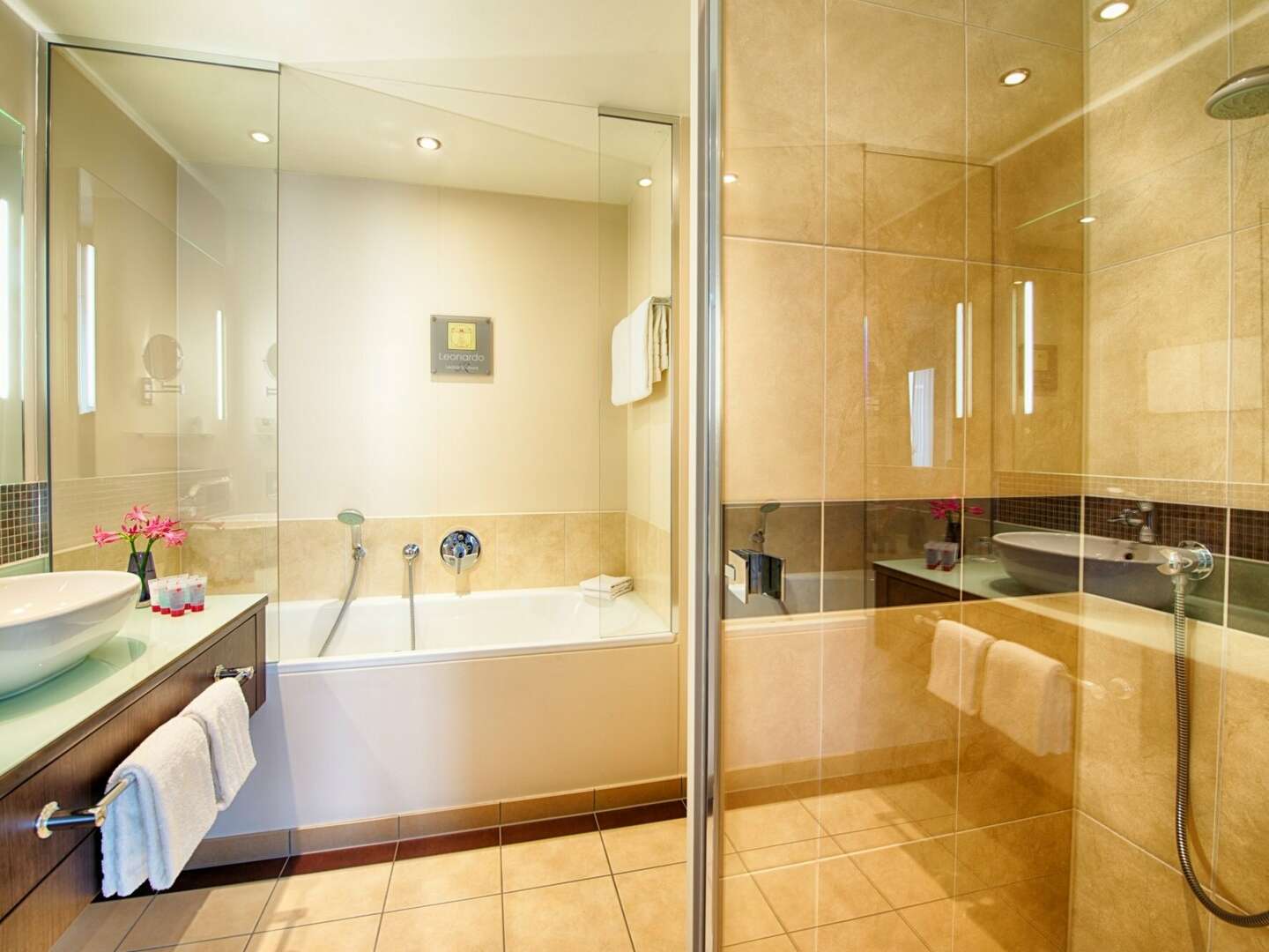 Mit hohen Decken, natürlichem Tageslicht und einer großzügigen Gartenterrasse bietet das Leonardo Royal Hotel Munich eine ruhige Atmosphäre, die einen entspannenden Aufenthalt garantiert. Von dem Moment an, in dem Sie die stilvolle Lobby mit ihrer markanten Innenausstattung betreten, werden Sie verstehen, dass Sie sich in einem Vier-Sterne-Superior-Hotel befinden. Das Hotel verfügt auch über einen Fitnessbereich mit Fitnessgeräten, Sauna und eine Wellness-Lounge, damit Sie sich während Ihrer Zeit bei uns völlig entspannen können.